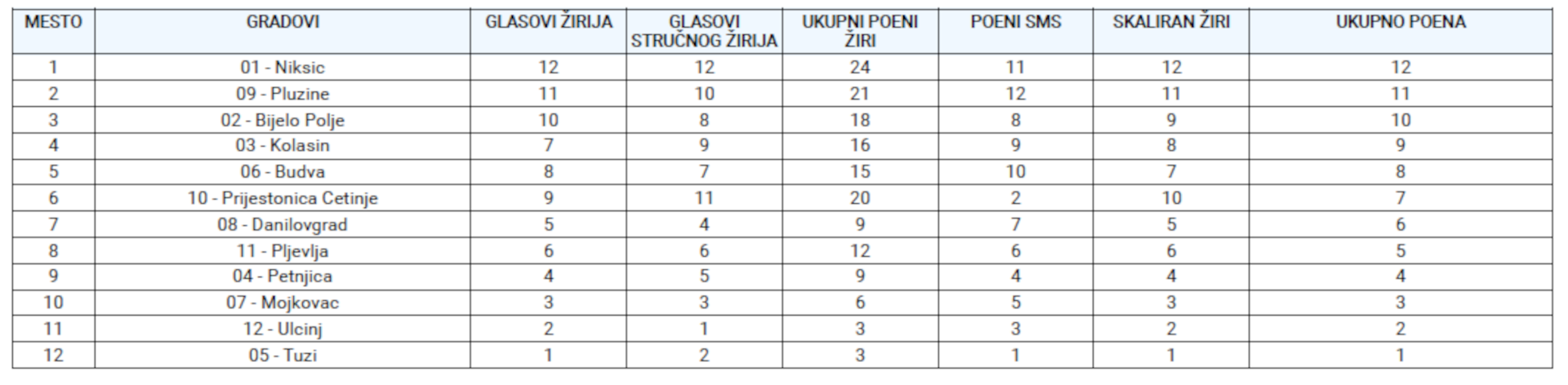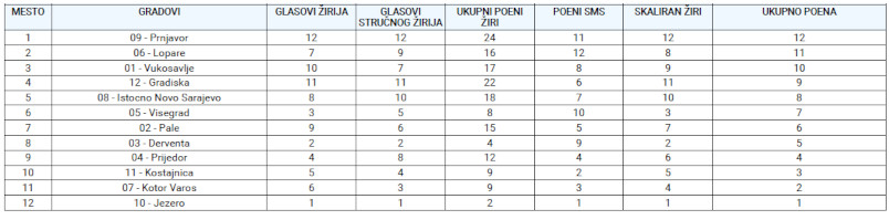 The points obtained from the expert jury are added to the points obtained from the jury of the participating cities and municipalities, and in this way the total points of the jury are obtained, which are added to the points from SMS voting (second stage).